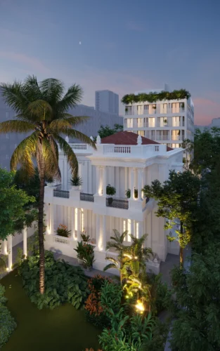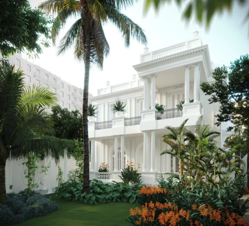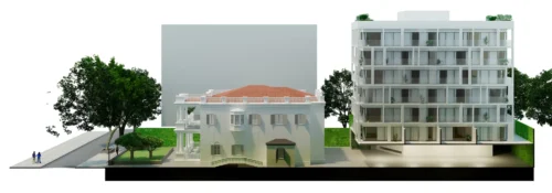 Um casarão de arquitetura eclética, construção histórica de Botafogo que faz parte da memória do bairro. Atrás, uma construção nova, com traços contemporâneos e ritmados.